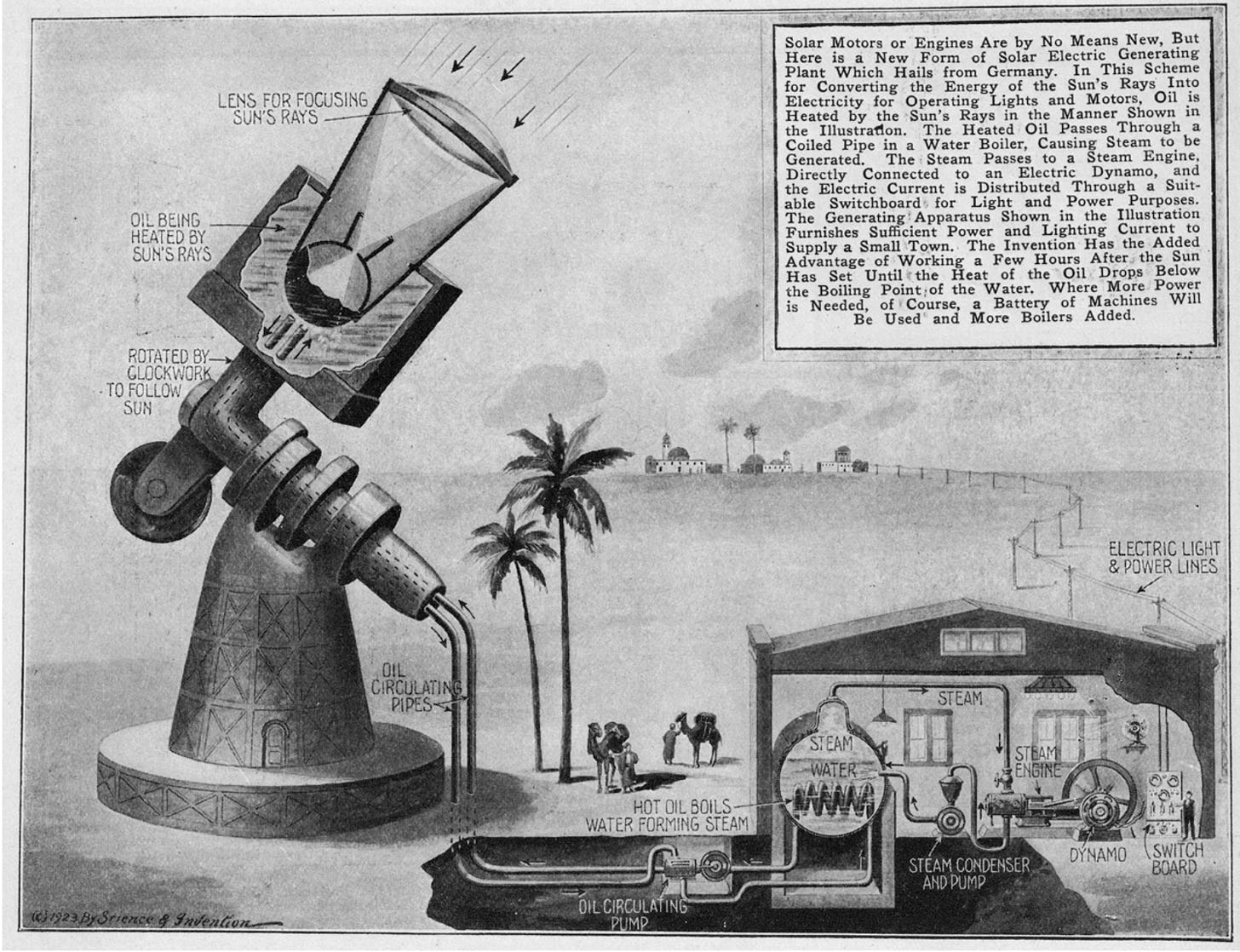 Futuristic solar power plant, as imagined in the October 1923 issue of Science and Invention
